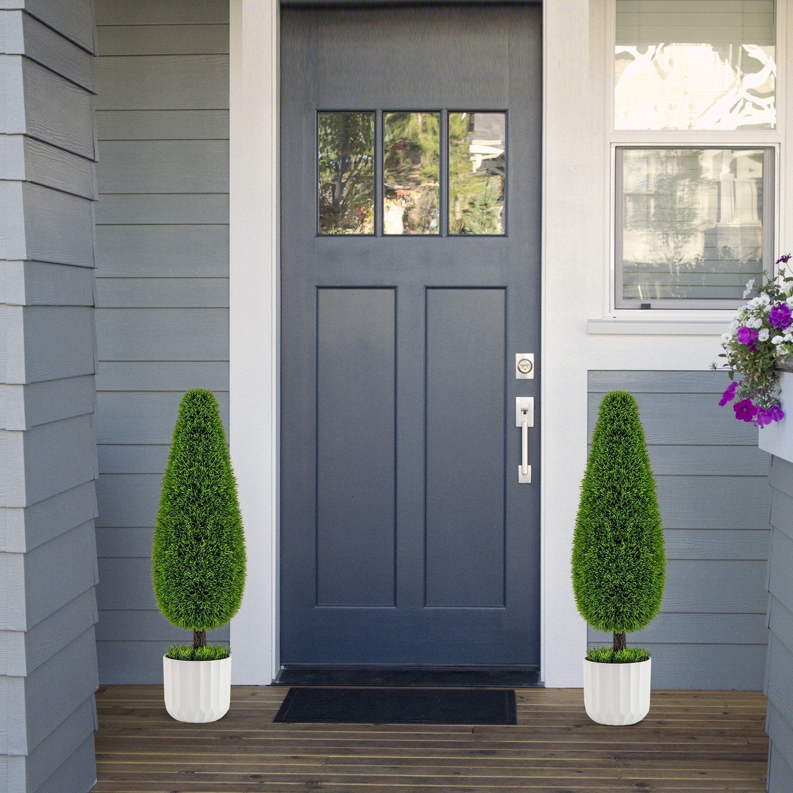 ● Premium New PE Material: Crafted from sun-proof PE material the 2-pack faux potted cypress bushes are suitable for outdoor use. Additionally the selected material is smell-free and allergic-proof making it a safe indoor decoration for households with kids and pets.