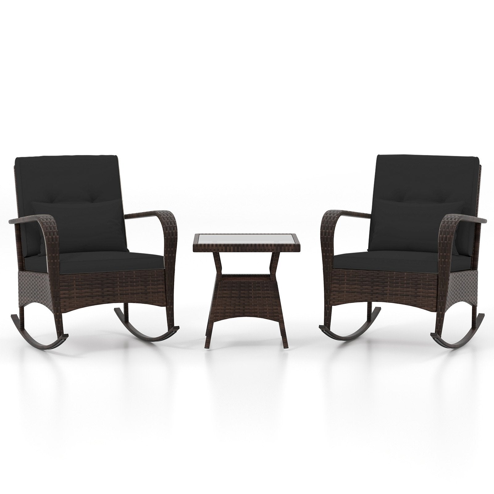 3 Pieces Outdoor Rocking Set with Tempered Glass Coffee Table for Backyard Poolside-Black