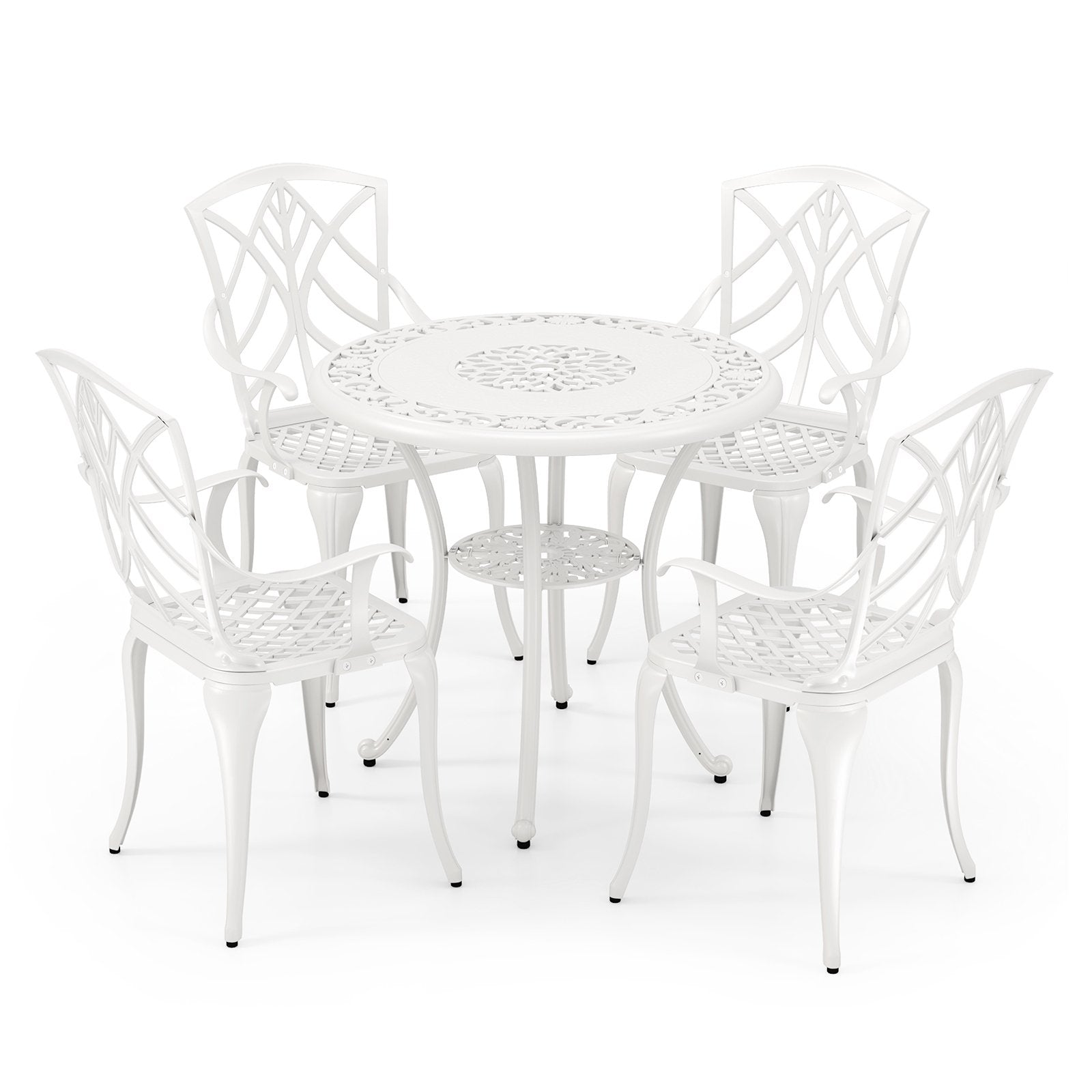 5 Piece Patio Cast Aluminum Dining Table Chair Set Bistro Set with Umbrella Hole-White