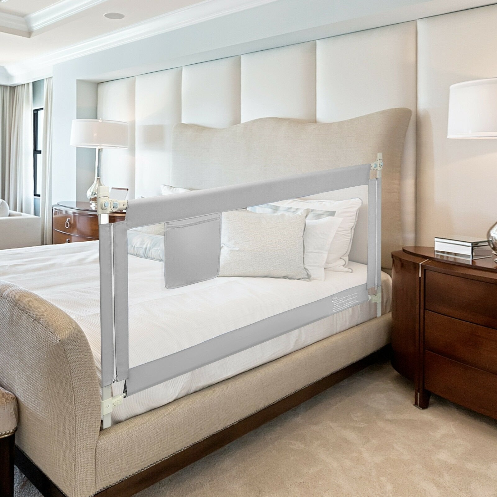 69.5 Inches Toddler Bedrail with Anti-Collision Cotton and Side Pocket-Gray
