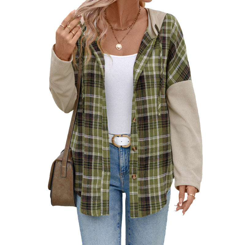 Casual Retro Style Loose Hooded Plaid Stitching Shirt Coat Women