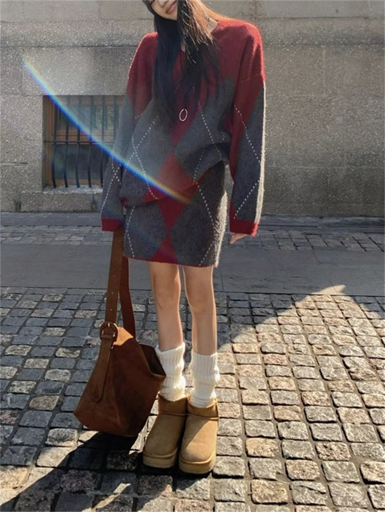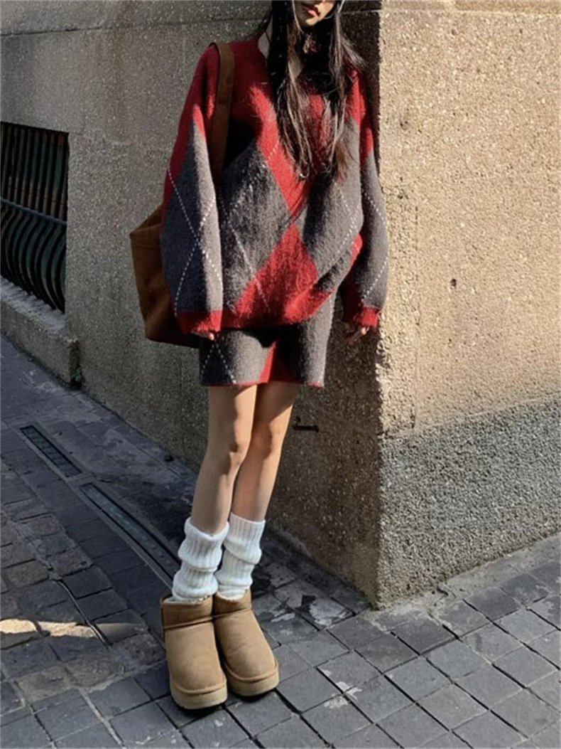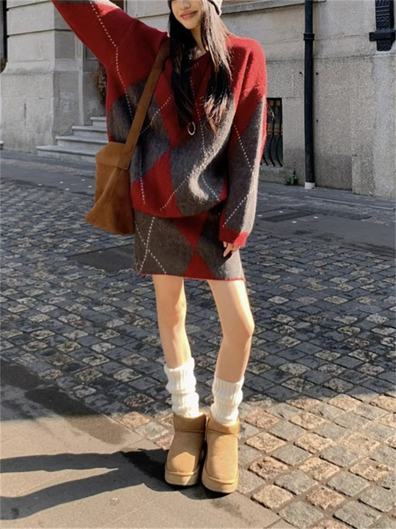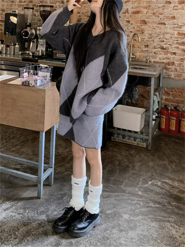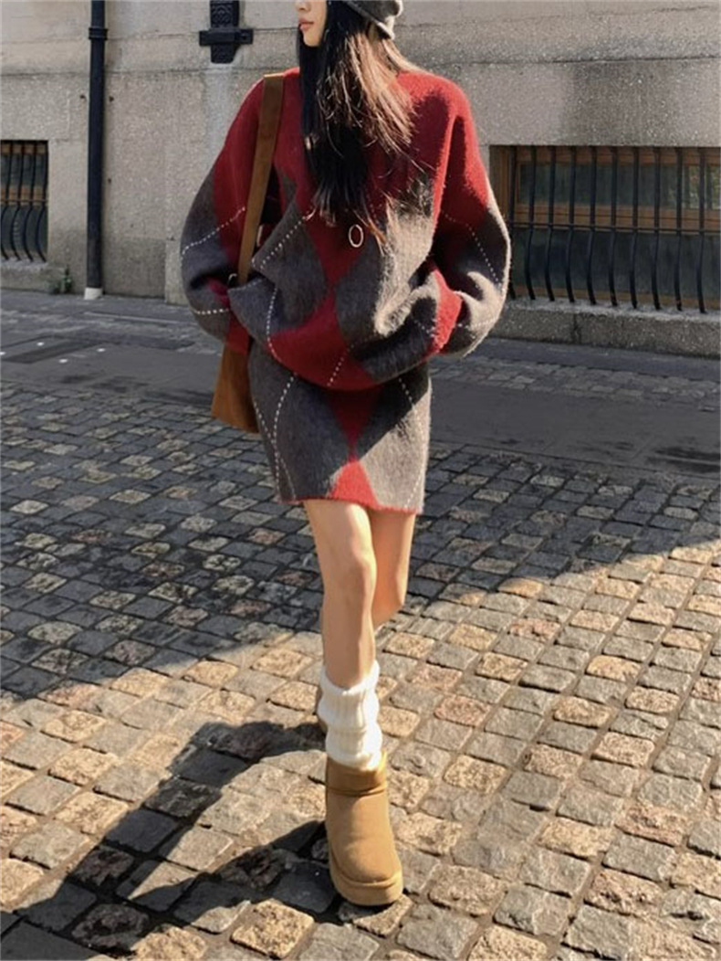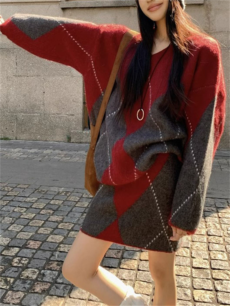 Fashionable Knitted A- Line Short Skirt Two-piece Set For Women
