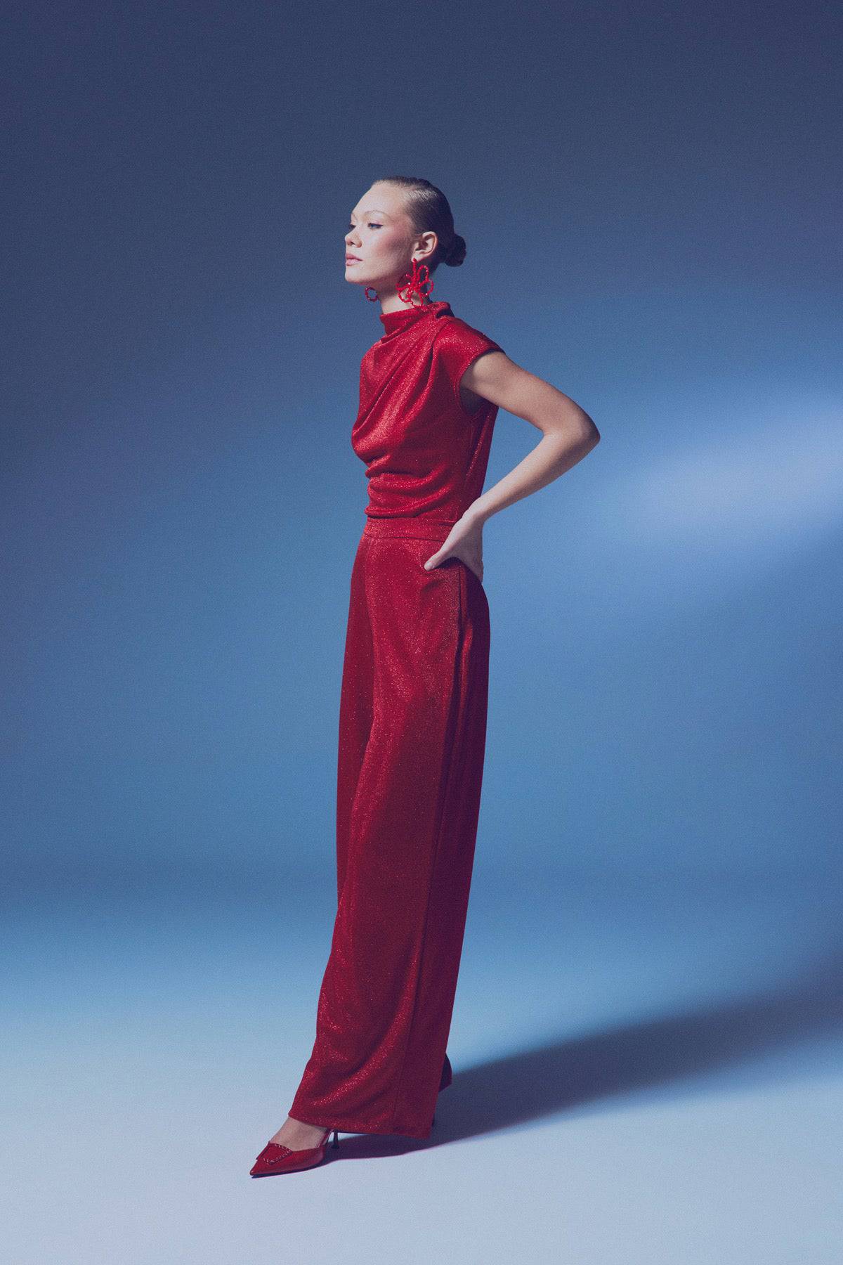 Mock neck, cap sleeves, snap fastener at the bottom, one shoulder gather detail, back collar button, flexible, glittery bodysuit blouse.