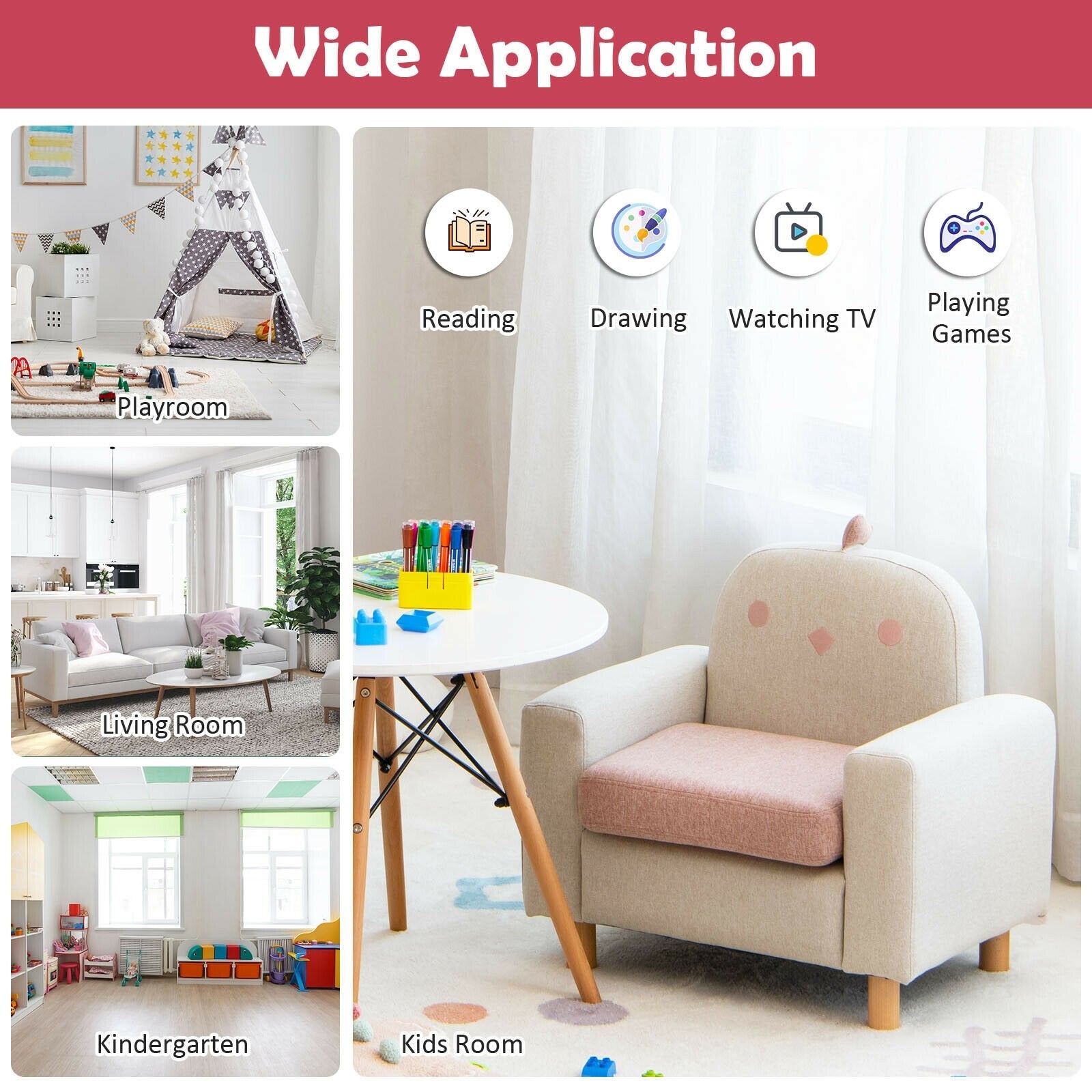 ● Solid Wood Frame and Premium Fabric: This kid's armchair features sturdy solid wood construction that is capable of weighing up to 165 lbs and is durable for years of use. Besides the skin-friendly and breathable fabric are comfortable to touch and harmless to the health of children. The sturdy beech wood legs with non-slip pads also add extra safety.