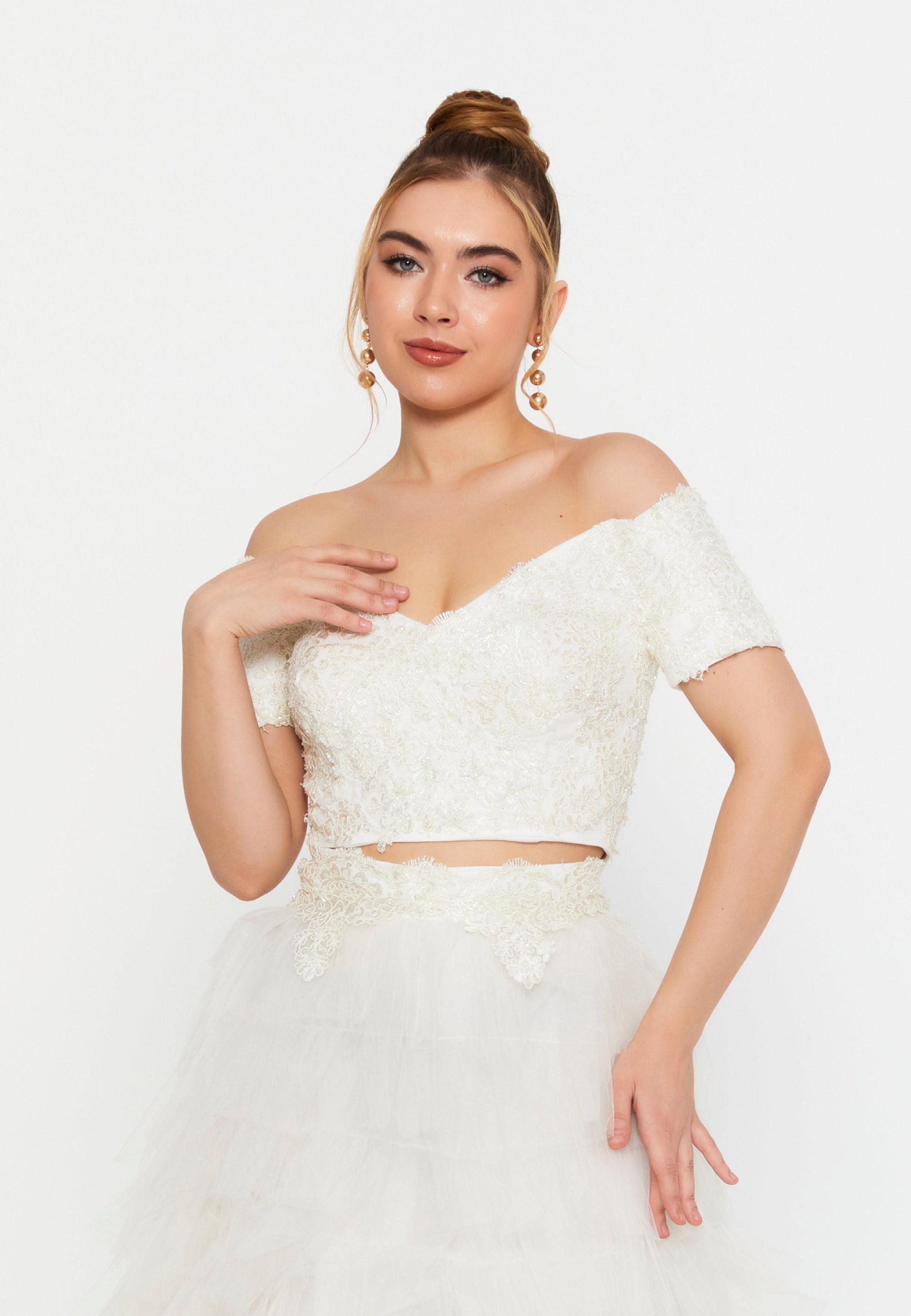 Romantic white lace crop top and tiered tulle maxi skirt—perfect for bridal showers, engagements, civil ceremonies, or any white dress occasion.