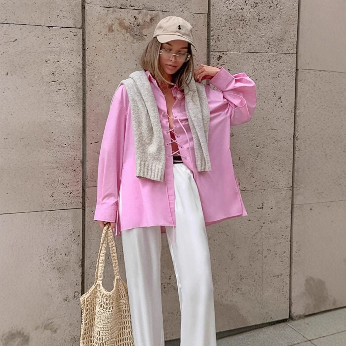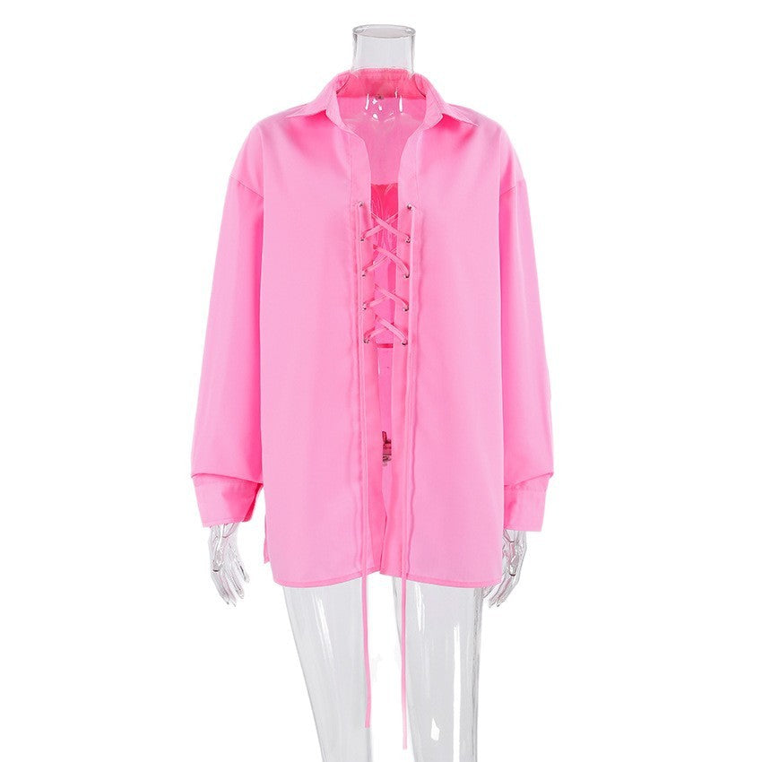 Women's All-matching Lapel Rope Lace-up Long Sleeve Shirt