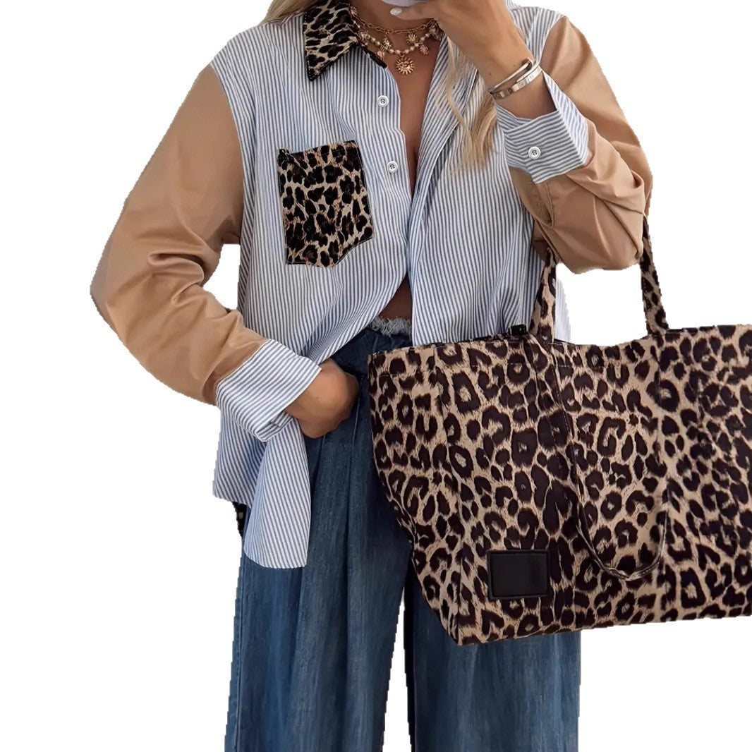 Women's Loose Leopard Print Patchwork Stripes Shirt